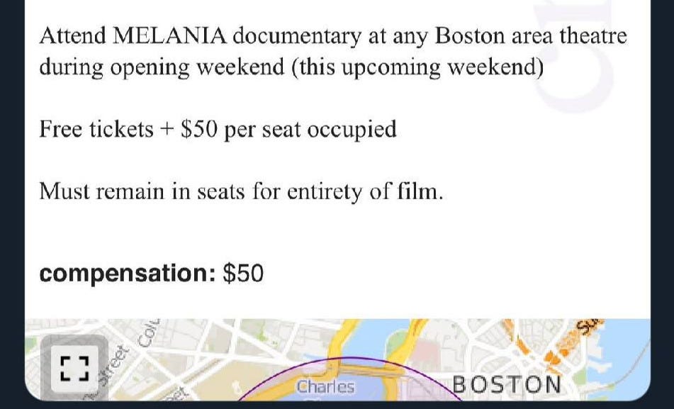 Yes, Amazon and MAGA are in such a panic over “Melania” flop they are now giving away tix—and even paying people to go see it. Here’s a Craiglist post in Boston. Seems like good deal until you get to the part where you must stay in your seat for the entire two hours.