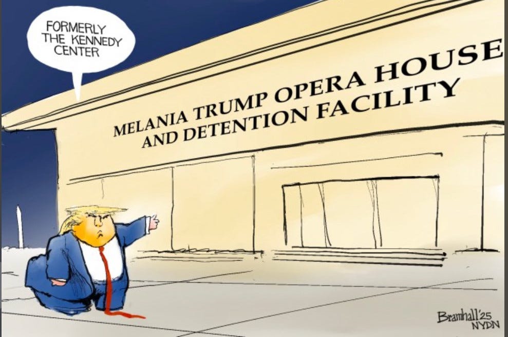 As you may have heard, Trump is closing the Kennedy Center in July for two full years for a complete, no doubt gold-plated, incredibly costly, overhaul—not only to make it more of a tribute to himself but to get around the embarrassment of no one wanting to perform there and stupendous financial losses.