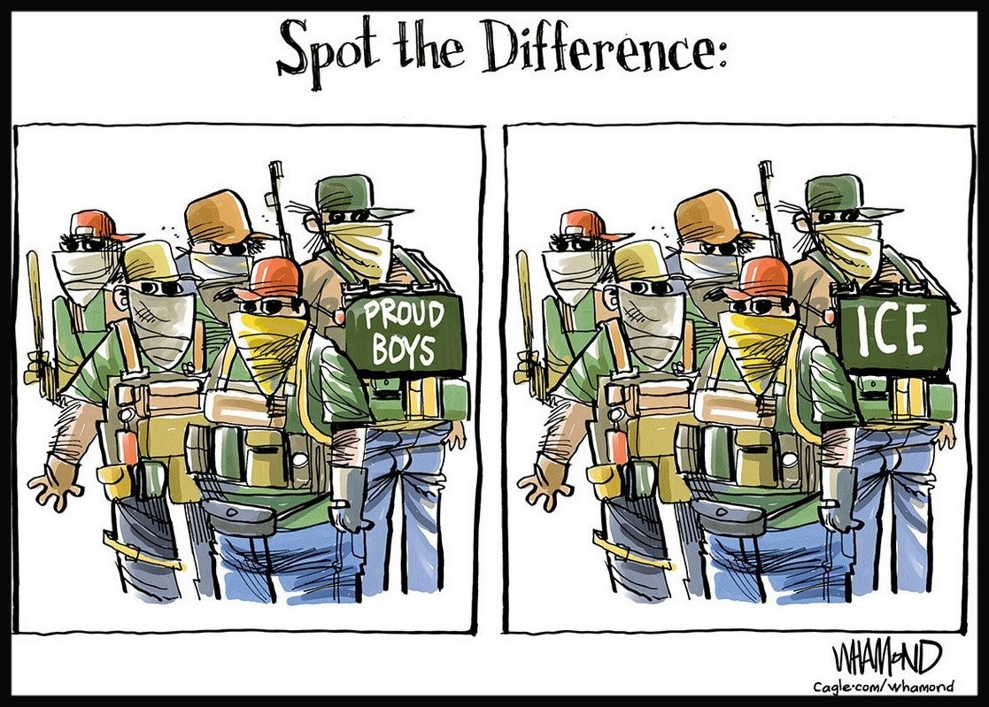 Sending armed, masked, poorly trained, masked and out-of-control armed thugs into blue cities is, in effect, a war on Americans, just as January 6thwas a war on American institutions. In effect, Trump would rather savage his own people than be held accountable for his actions. So in Trump’s mind, Renee Nicole Good’s murder is at most collateral damage….