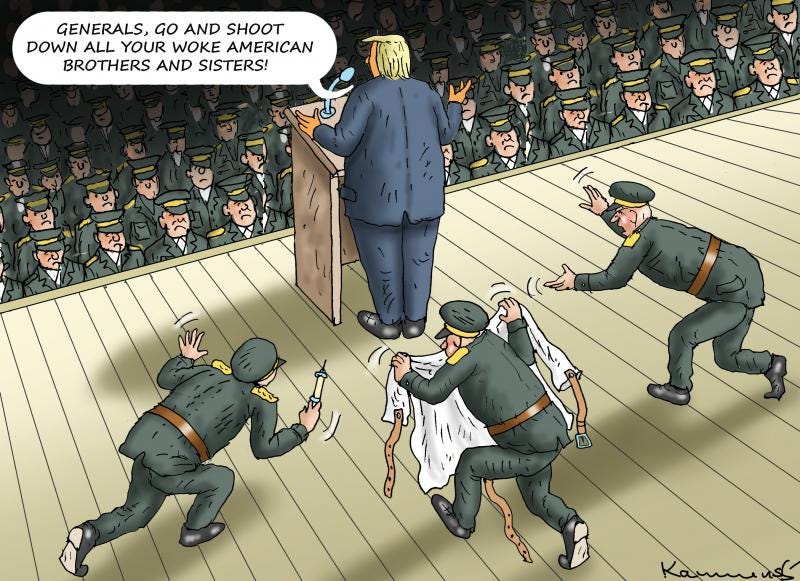 But the greatest, and most troubling, comedy segment—in his usual dark, pathetic style—came from Trump yesterday in his “speech” to the generals when he went up the down escalator here: