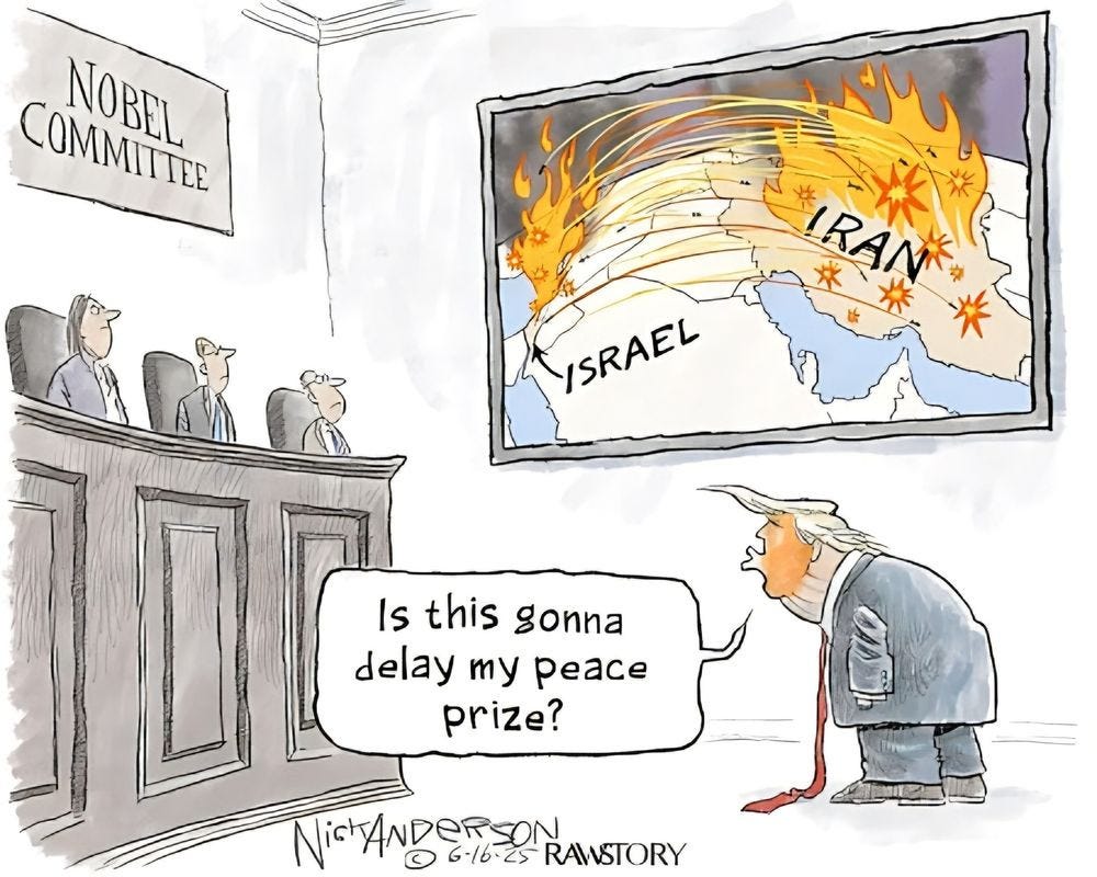As noted a few days back, taking a much-needed break but feel the call to at least post some sharp cartoon commentary on bomb-bomb-bomb Iran. And a viral tweet: “Good thing Congress isn't alive to see this.”